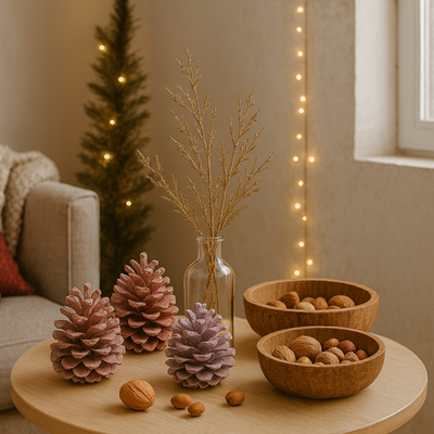 - Piñas y frutos secos: Son detalles económicos y ecológicos que añaden textura y encanto natural.